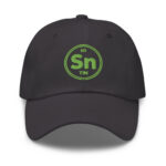 The hat doesn’t say TINFOIL. It says tin in the language of the periodic table, and lets you do the math. The kind of embroidery that gets a nod from a stranger in an airport and a question from everyone else.