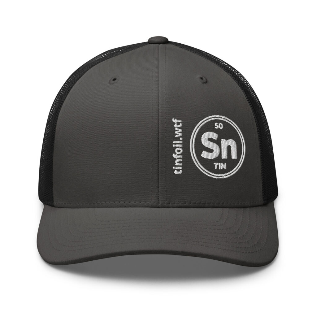 The hat doesn’t say TINFOIL. It says tin in the language of the periodic table, and lets you do the math. The kind of embroidery that gets a nod from a stranger in an airport and a question from everyone else.